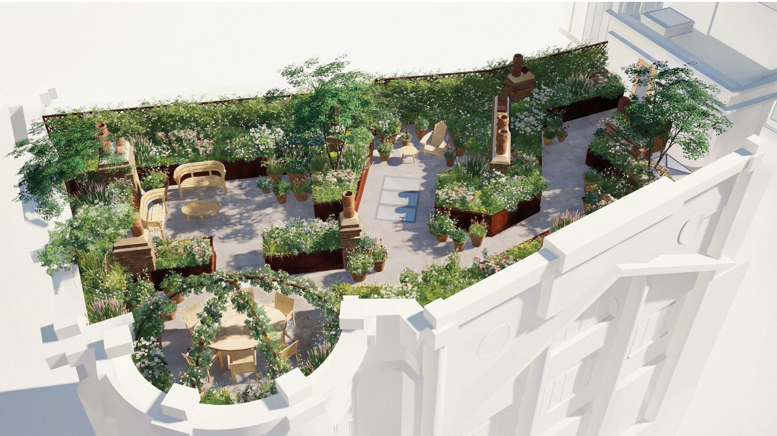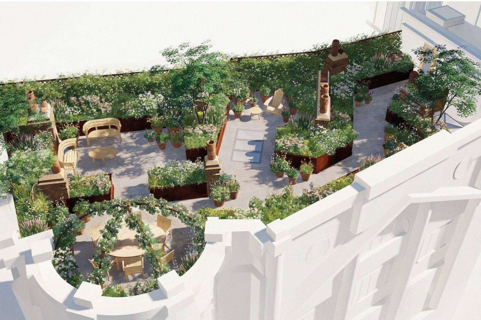 The design weaves together multi-stem trees, aromatic shrubs, herbs and seasonal bulbs to create a resilient roof garden tailored to London’s changing climate. Lightweight soils, specialist irrigation and careful structural coordination ensure long-term performance, reflecting our expertise in complex roof terrace design. Burnished metal planters, elegant porcelain paving, terracotta pots and a bespoke dining arbour introduce warmth and craftsmanship, while trellises and evergreen structure offer privacy without interrupting protected street-level views.